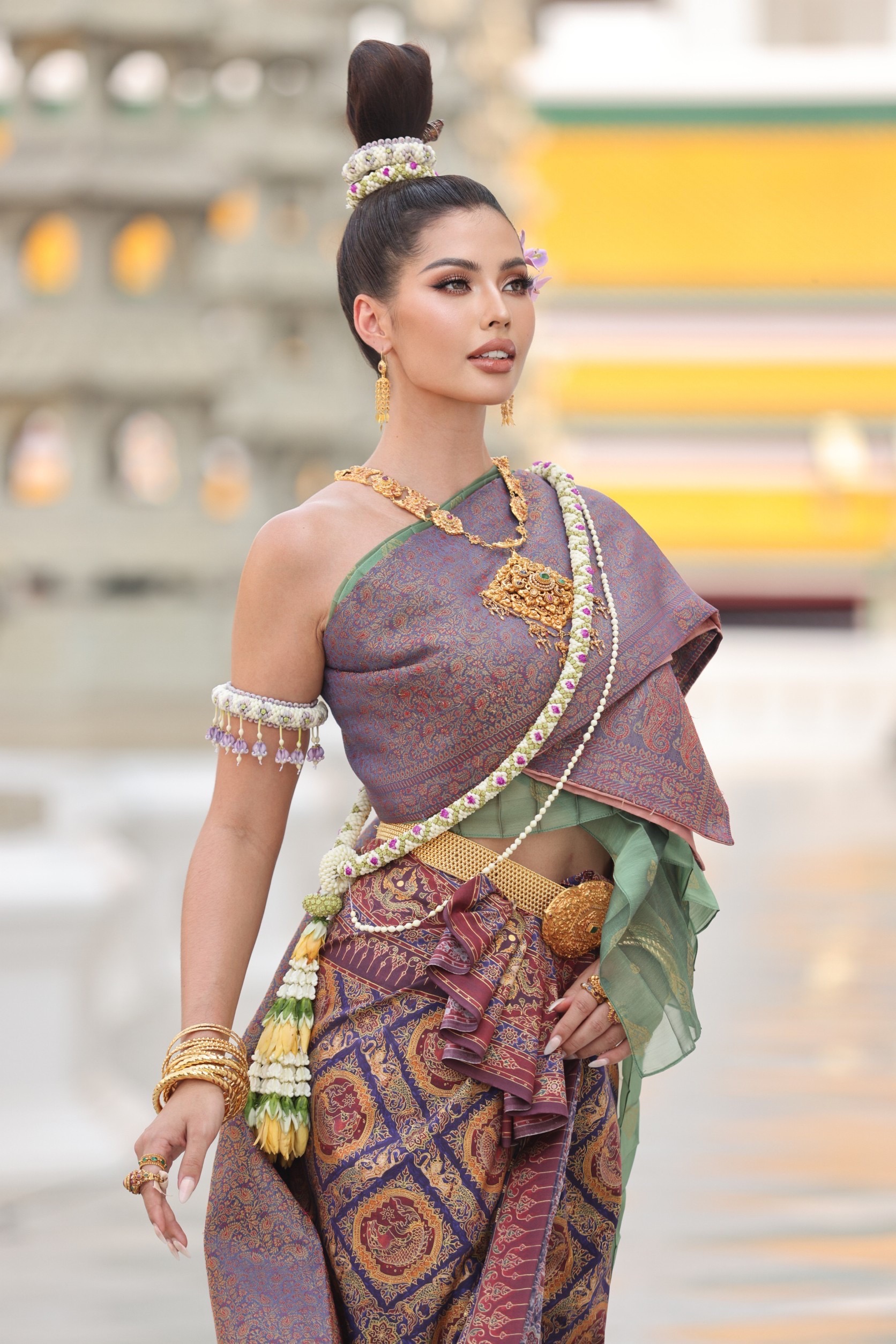 มูลค่าแปดแสนบาท ห่มผ้าสะพักทอดิ้นทองนำเข้าจากอินเดีย ห่มสไบแพรลายพุ่มข้าวบิณฑ์สีเขียว ทำผมอย่างสตรีโบราณ เรียกว่า “โองโขดง” คือการมัดมวยเกล้าสองพับ